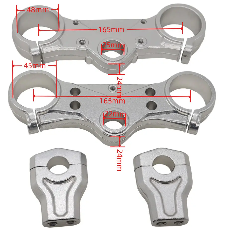 45 மிமீ 48 மிமீ போலியான டிரிபிள் கிளாம்ப், அதிக வலிமை கொண்ட போலி அலுமினியத்தில் இருந்து வடிவமைக்கப்பட்டுள்ளது, இது விதிவிலக்கான நீடித்துழைப்பு மற்றும் அழுத்தத்தின் கீழ் வளைக்கும் எதிர்ப்பை வழங்குகிறது. அதன் துல்லியமான வடிவமைப்பு உகந்த பொருத்தம் மற்றும் சீரமைப்பை உறுதி செய்கிறது, சவாரிகளின் போது மேம்படுத்தப்பட்ட கட்டுப்பாட்டுக்கான கையாளுதல் மற்றும் நிலைத்தன்மையை மேம்படுத்துகிறது. இலகுரக மற்றும் வலுவான, தேவையான அனைத்து வன்பொருள்களுடன் இந்த கிளாம்ப் நிறுவ எளிதானது, இது அமைப்பை தொந்தரவு இல்லாமல் செய்கிறது. போட்டி பந்தயம், ஆஃப்-ரோட் ரைடிங் மற்றும் தனிப்பயன் உருவாக்கம் ஆகியவற்றிற்கு ஏற்றது, 45mm 48mm போலியான டிரிபிள் கிளாம்ப் பல்வேறு மோட்டார் சைக்கிள்களுக்கான செயல்திறன் மற்றும் பாதுகாப்பை மேம்படுத்துகிறது, இது ஆர்வலர்கள் மற்றும் தினசரி ரைடர்ஸ் இருவருக்கும் பல்துறை தேர்வாக அமைகிறது.